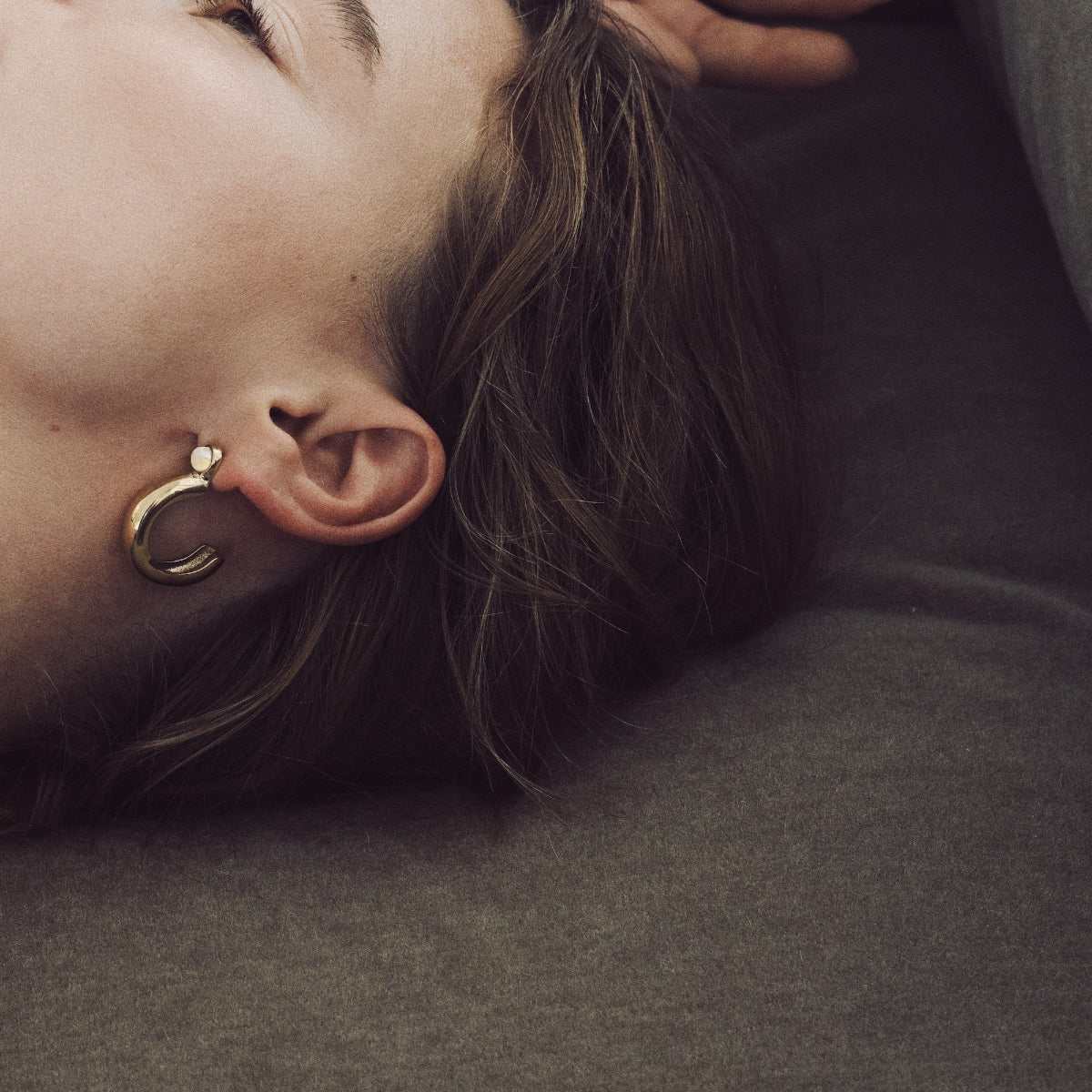 Pebble hoop in bronze with vibrant malachite cabochon. An elegant lightweight accent for everyday. Sterling silver posts.