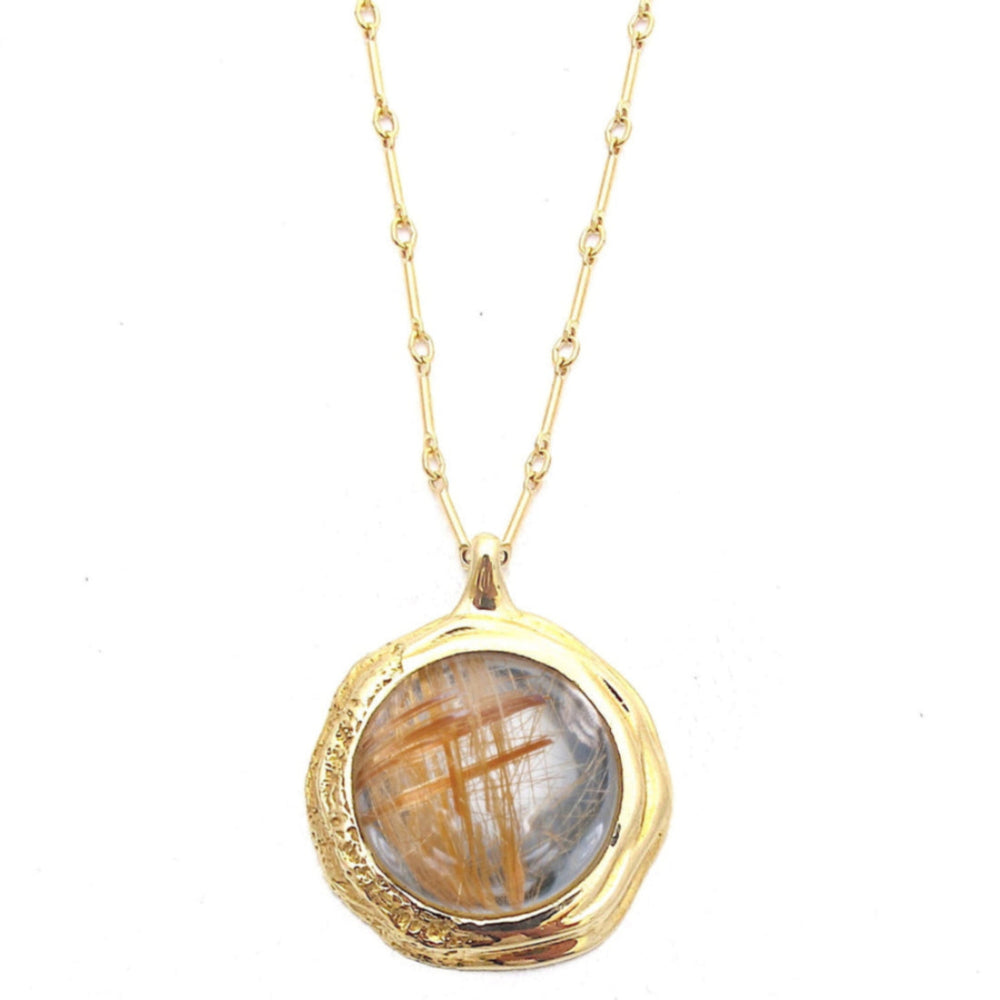 Gold-plated with a rutilated quartz cabochon — a stone of divine inspiration. This everyday talisman is designed to channel clarity, creativity, and higher guidance. Suspended on a 23" gold-filled link chain.