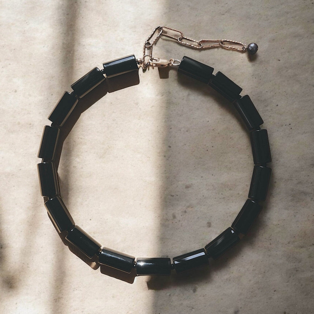 Lucent collar necklace. Sleek, onyx cylinder beads. Gold fill, black Tahitian pearl accent. Adjustable length 16-12". A bold modern accent.