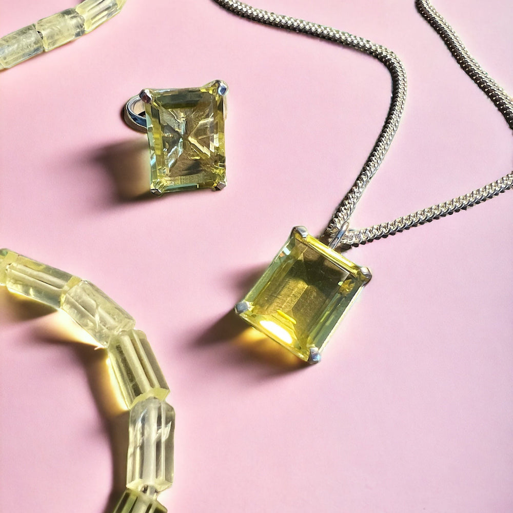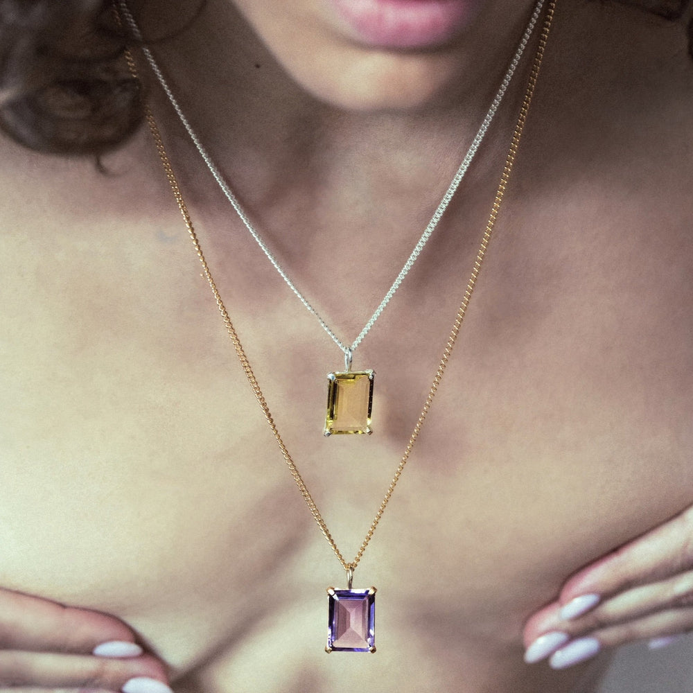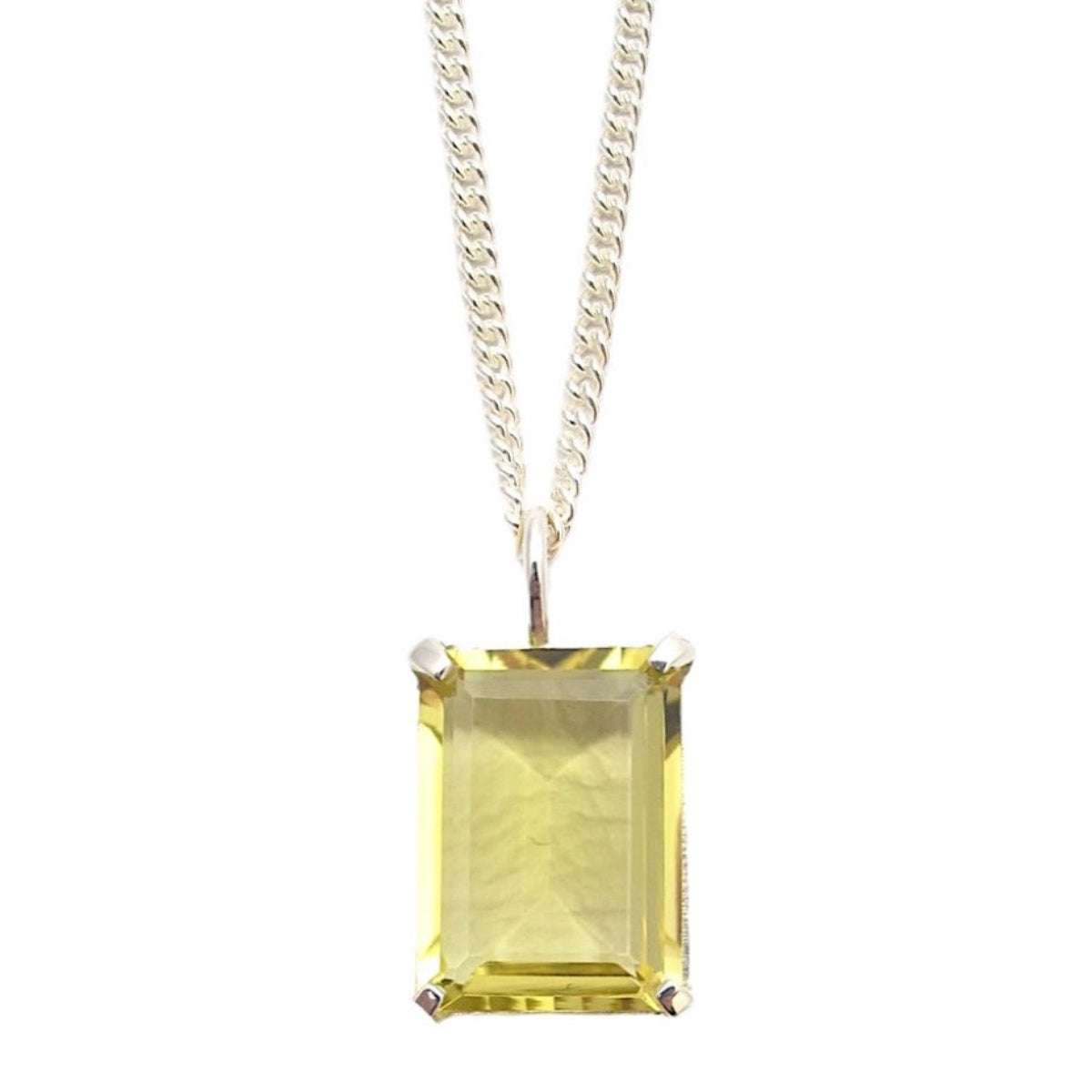 Lucent pendant with large, soothing lemon quartz in a Sterling silver Deco, prong setting. 19” Sterling silver curb chain. Also available gold plated on gold fill curb chain & in rose quartz. A beautiful modern heirloom for everyday layering or on its own.