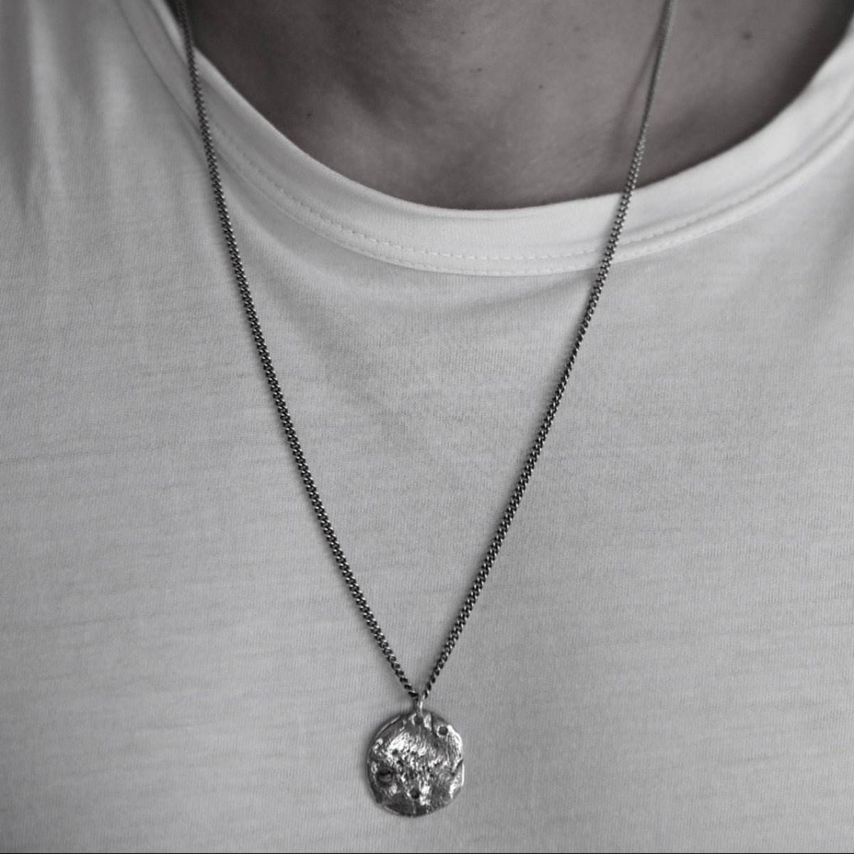 The Relic Coin pendant is a modern talisman. Cast in Sterling silver with a bezel-set, Tiger’s Eye cabochon — known for grounding and protective energy. This ancient coin motif suspends from a 24" long Sterling silver curb chain for layering or on its own.