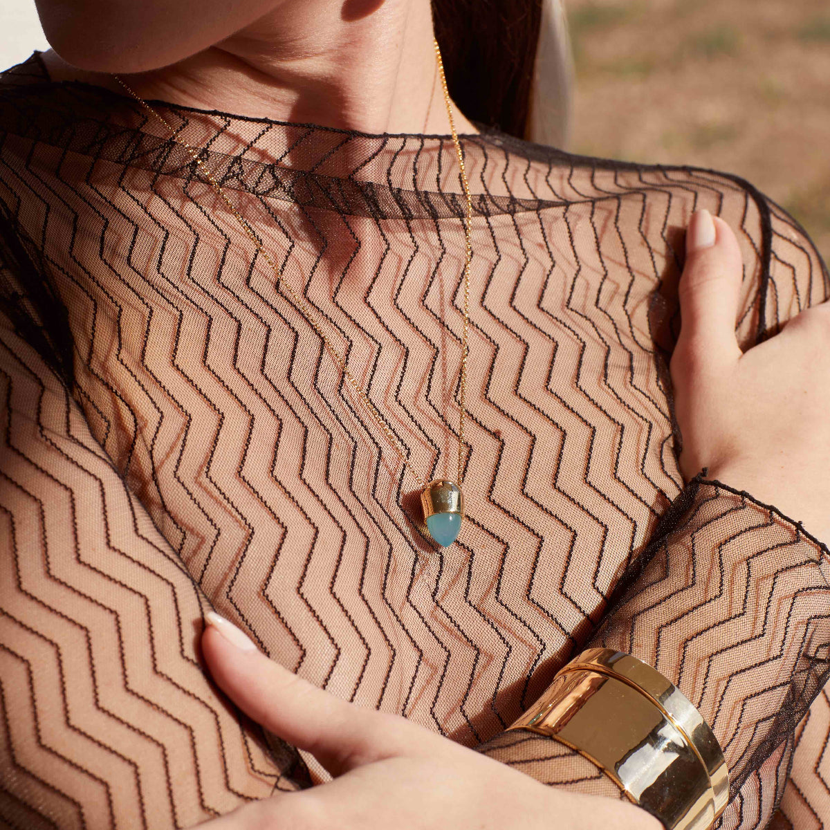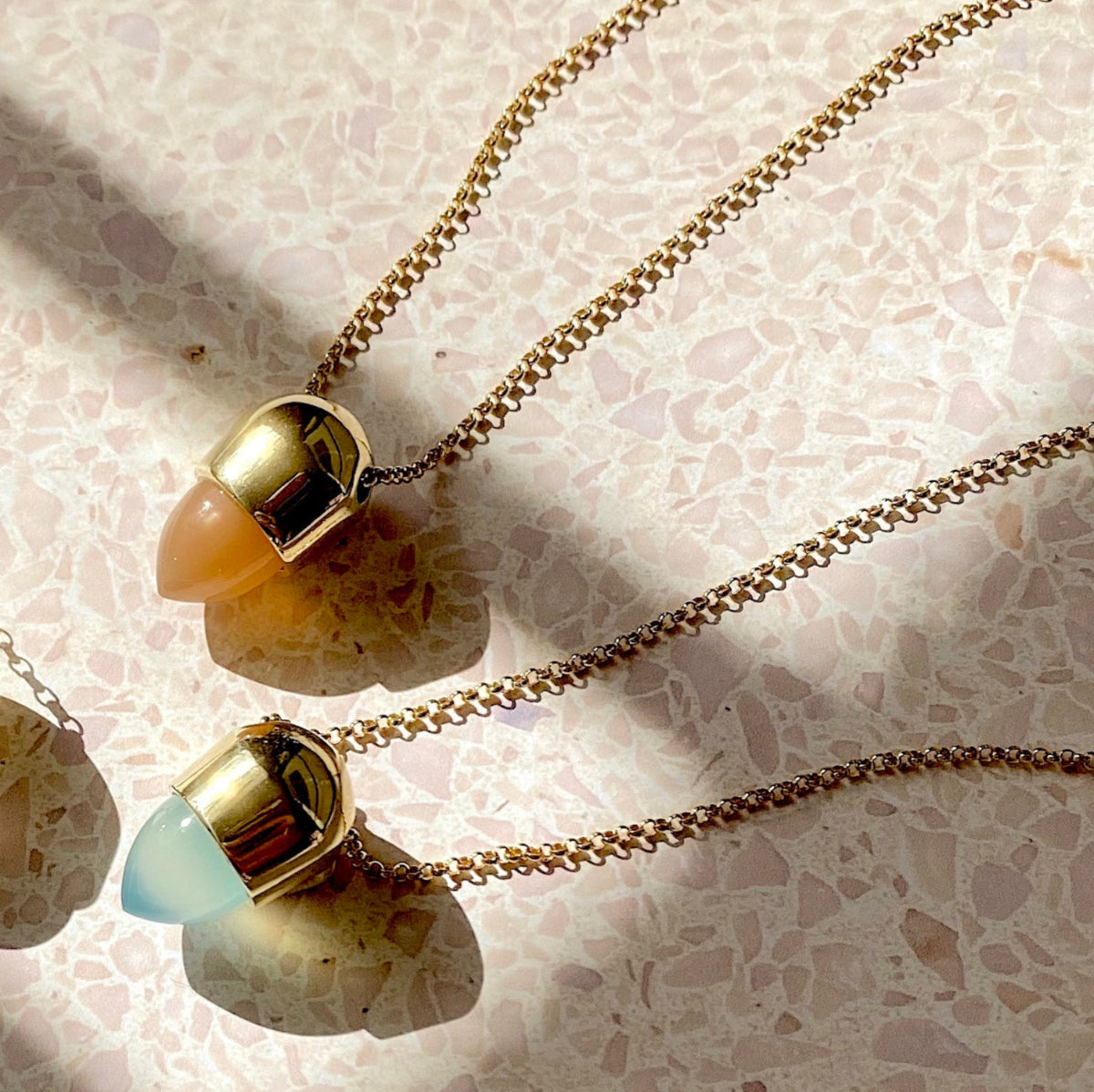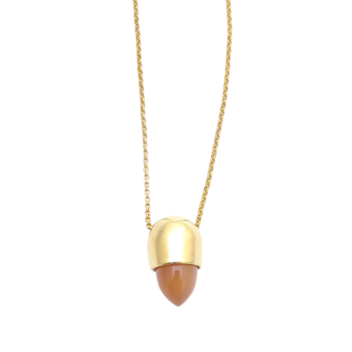 Regular price $265.00A sleek blend of modern minimalism and timeless elegance. The Signet pendant features a peach moonstone bullet cabochon — known for its soft glow and calming energy. Suspended from a 24" gold fill chain, it is a refined everyday accent that pairs effortlessly. Also available with Aqua chalcedony.
